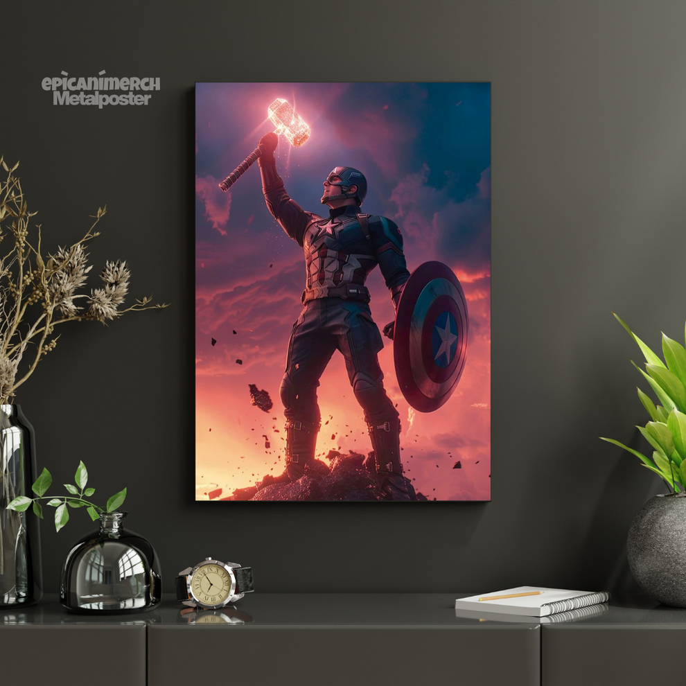 Captain America Holding Shield and Thor’s Hammer Metal Poster