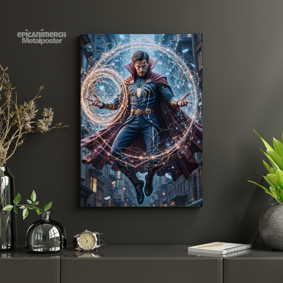 Dr. Strange in a Mid-Air Spellcasting Pose Against a Cityscape