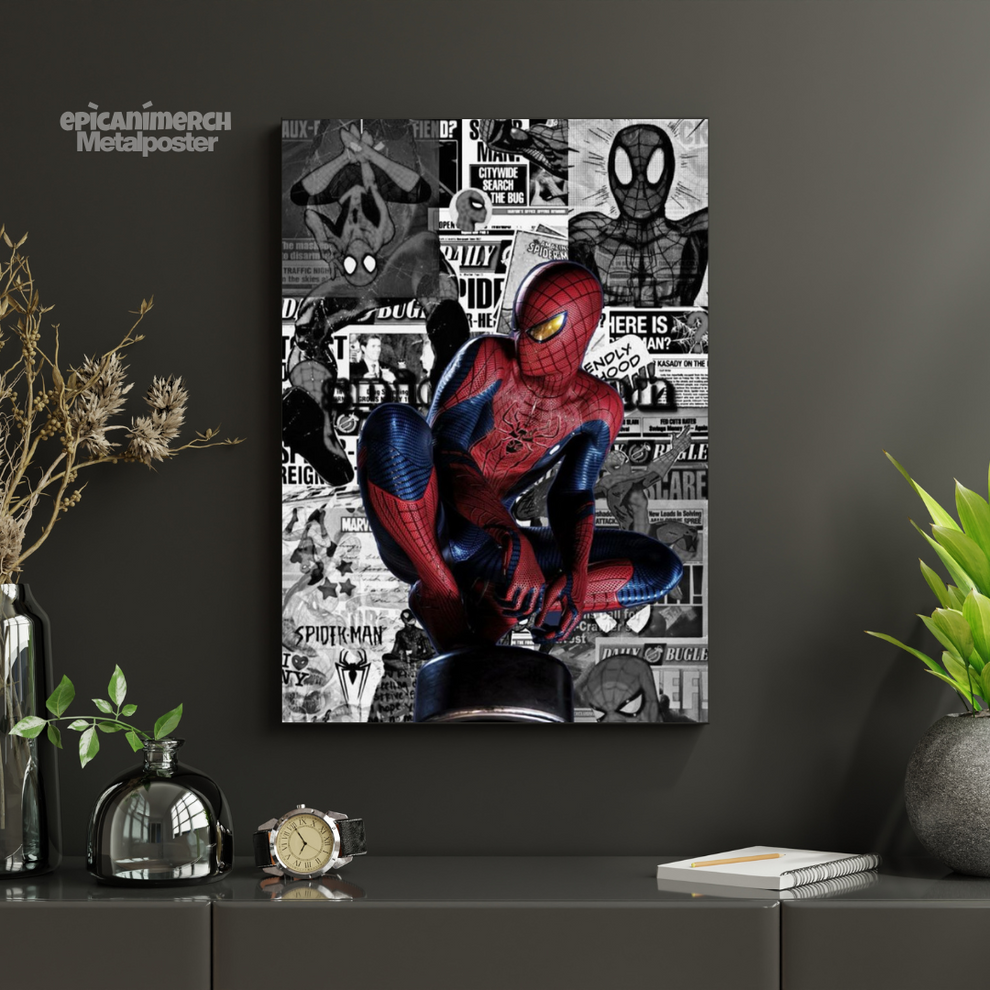 Spider-Man Swinging Across City Comic Style Metal Poster